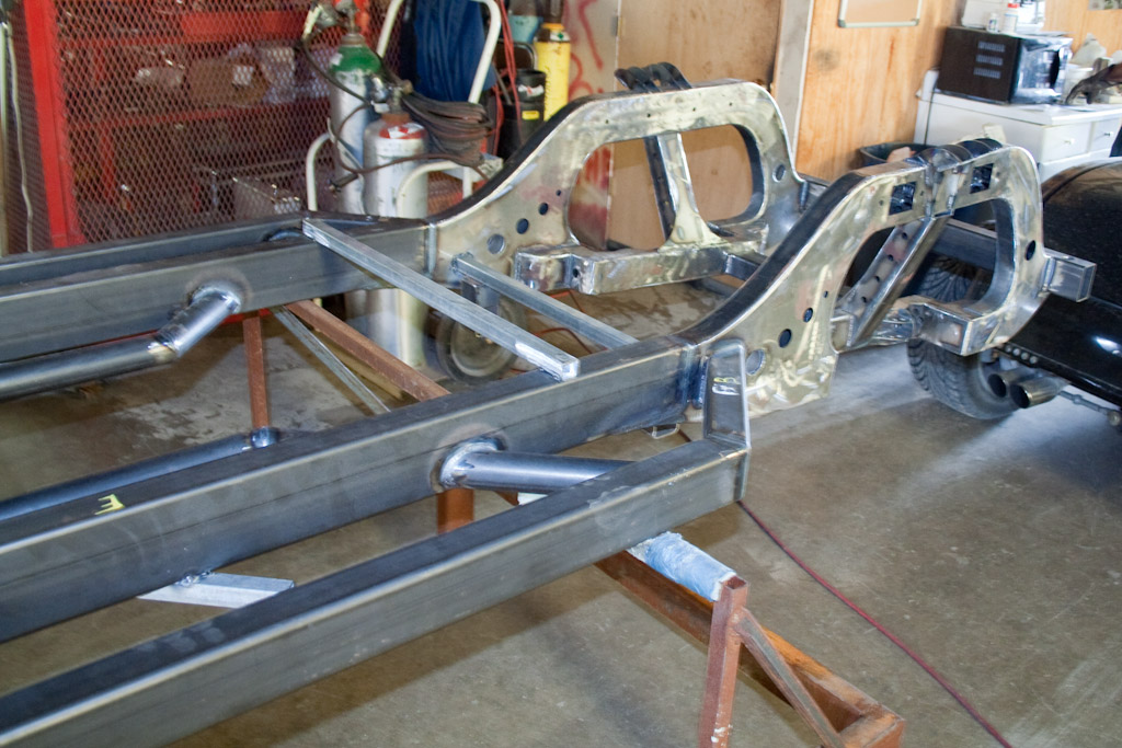 Back onto the jig table for driveline angling, exhaust and sheet metal work.