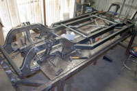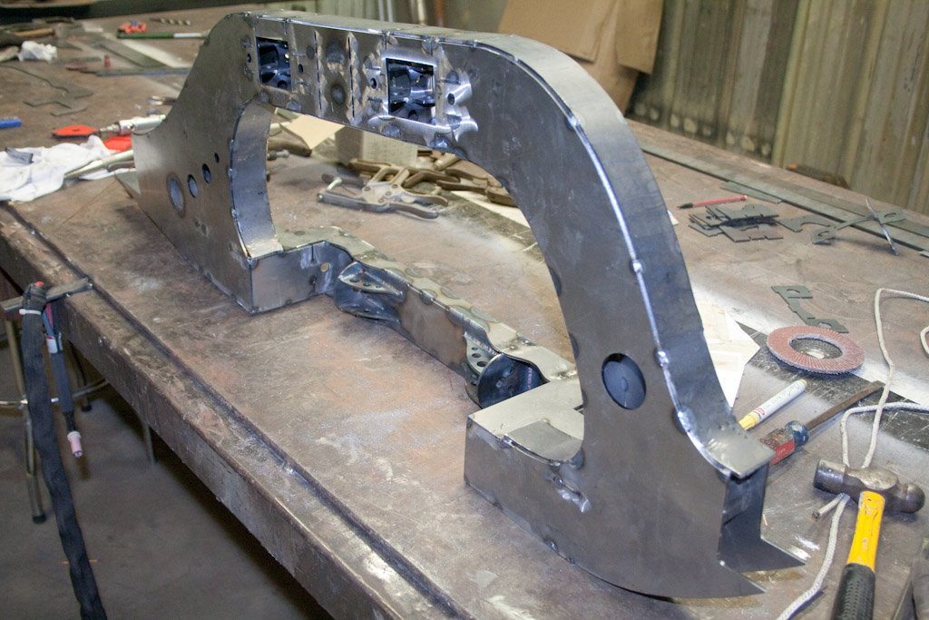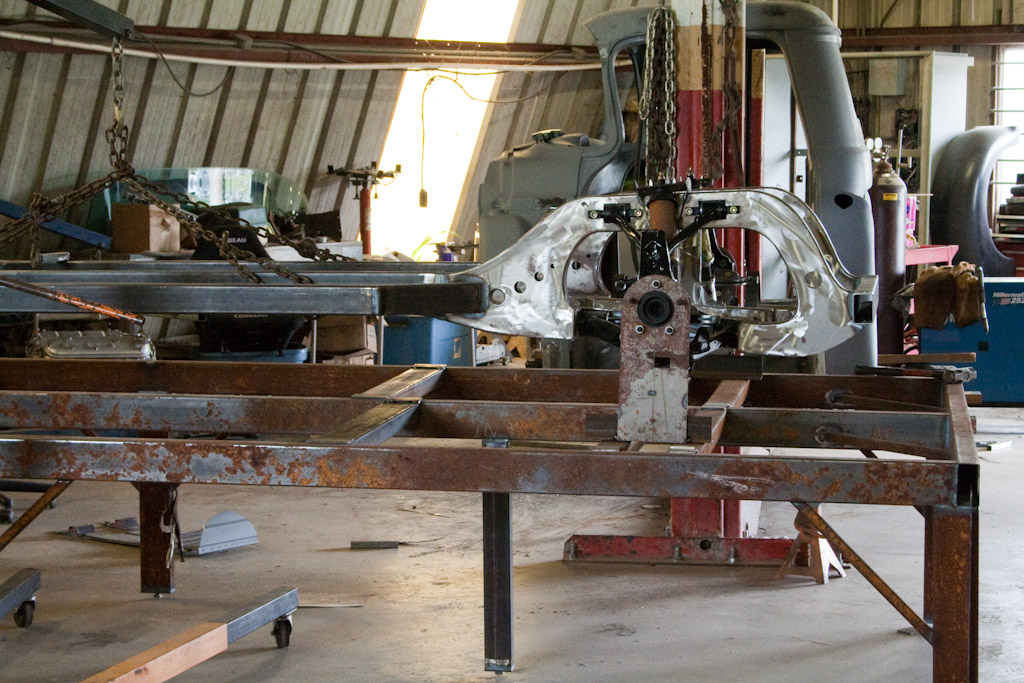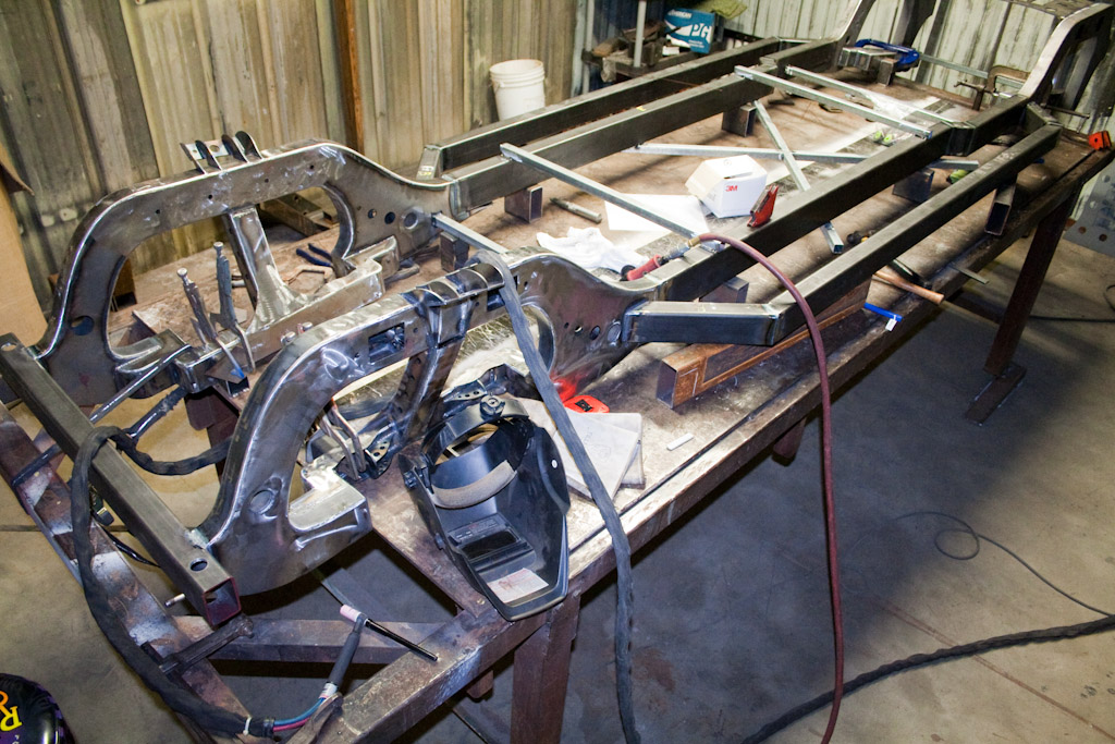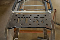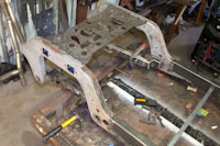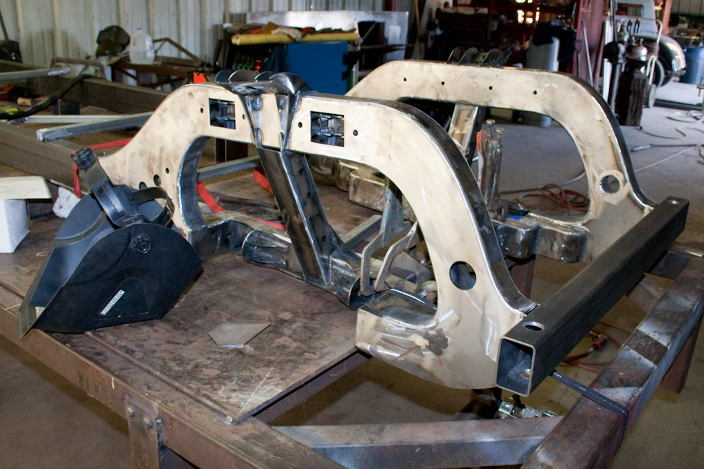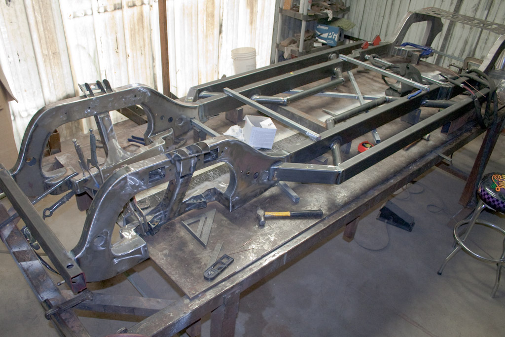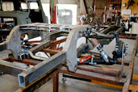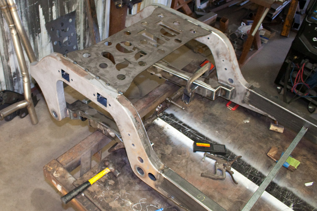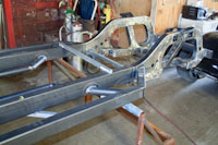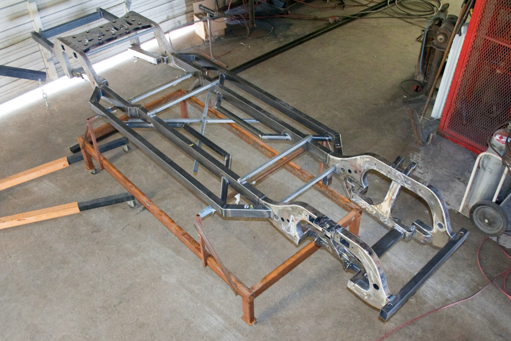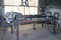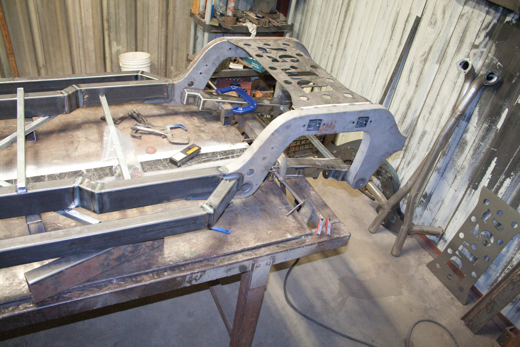 Back onto the jig table for driveline angling, exhaust and sheet metal work.