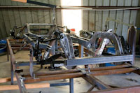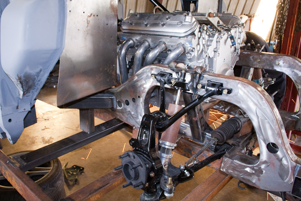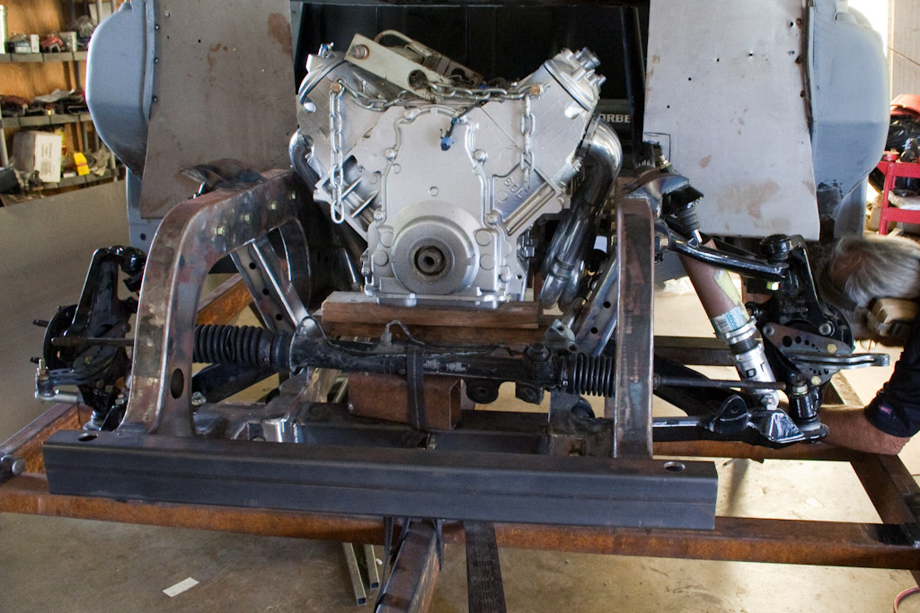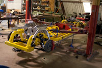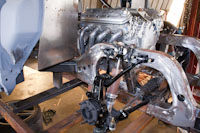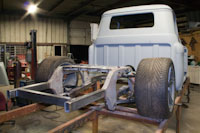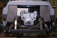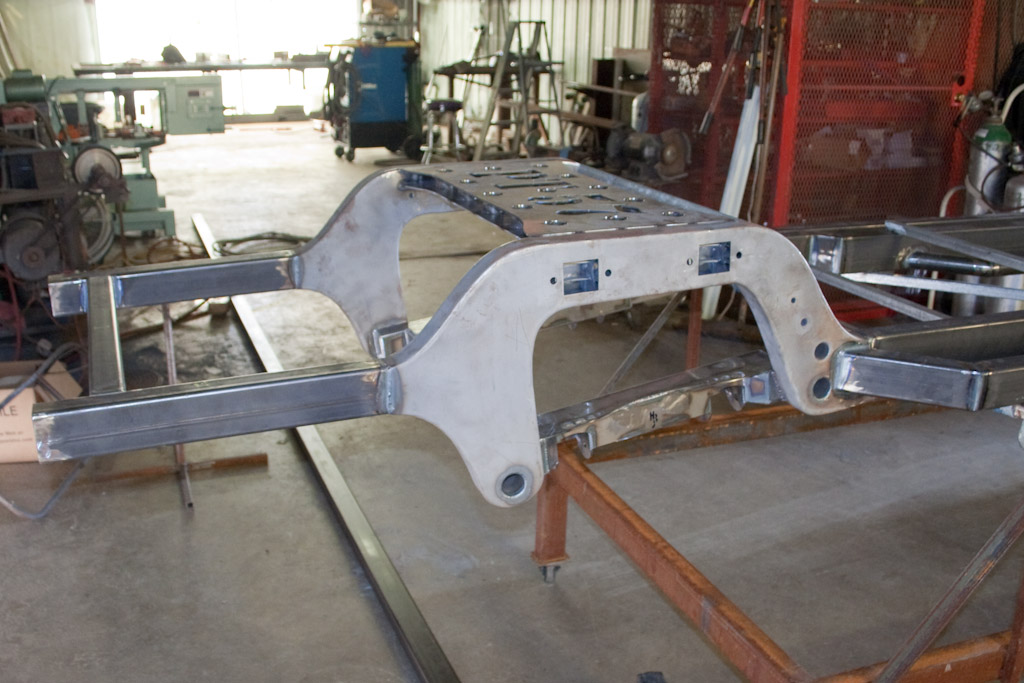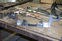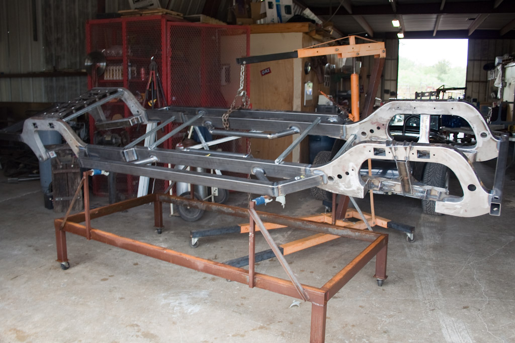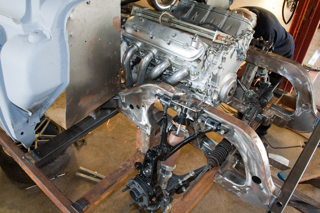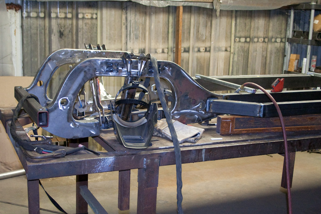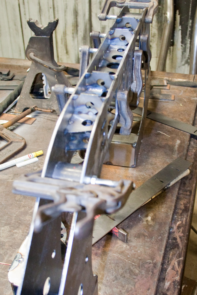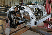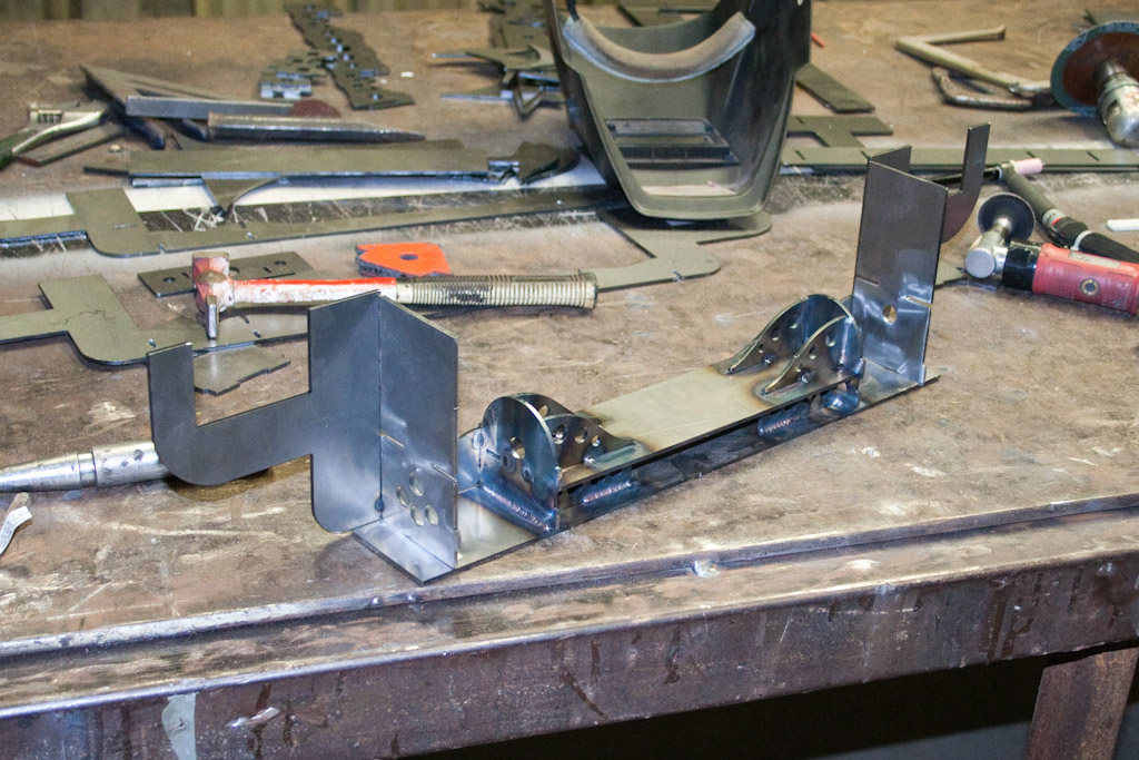Back onto the jig table for driveline angling, exhaust and sheet metal work.