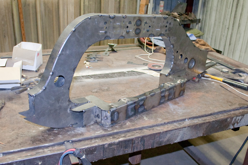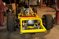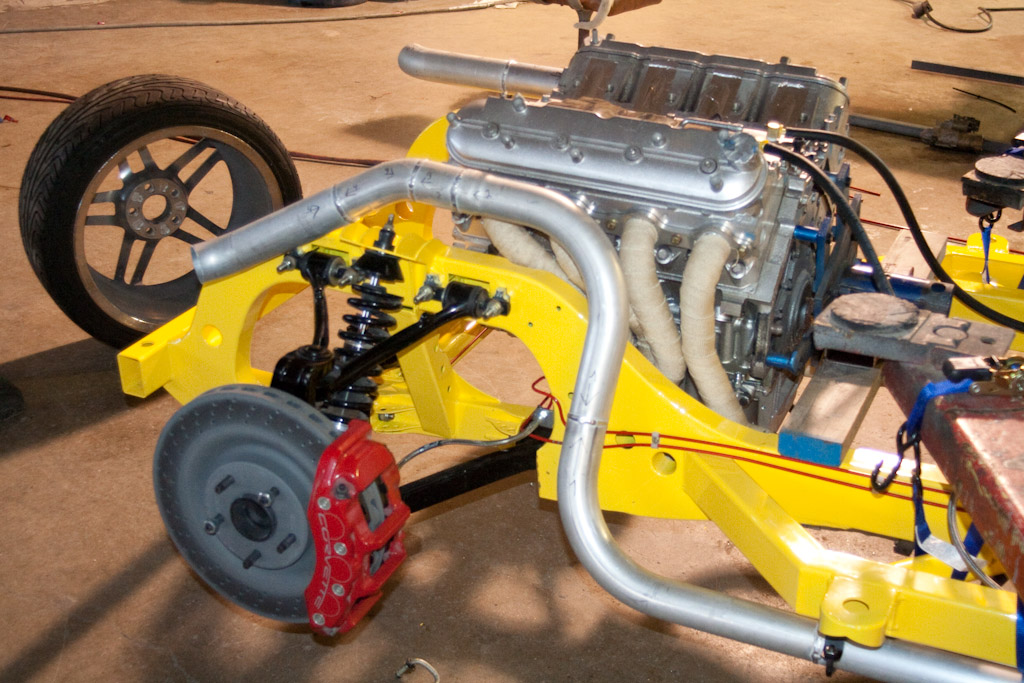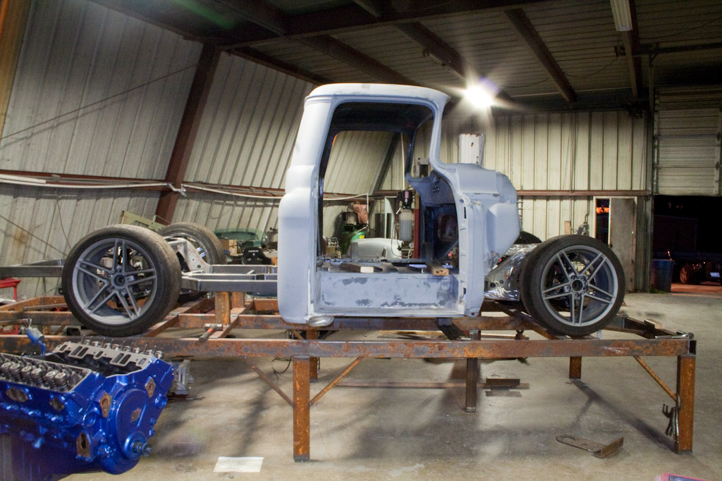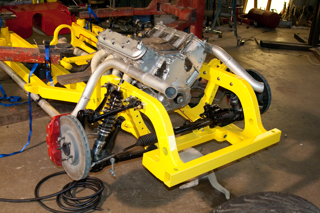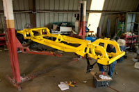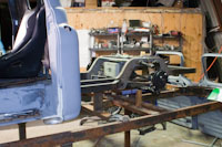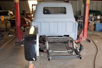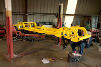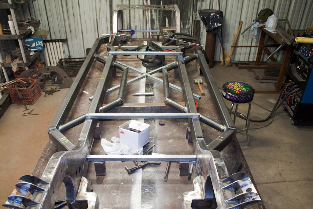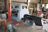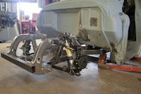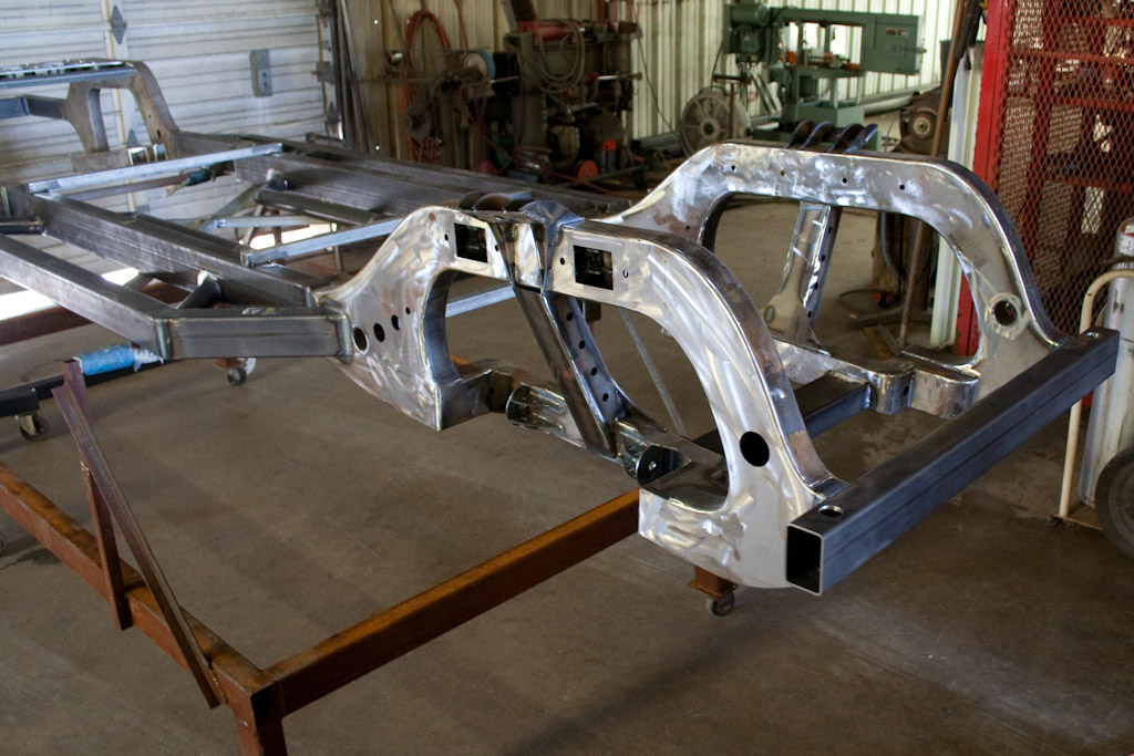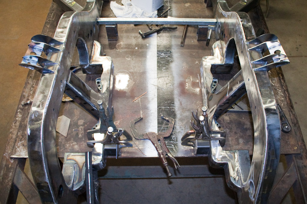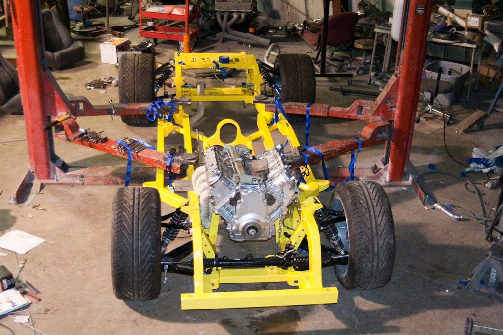 Back onto the jig table for driveline angling, exhaust and sheet metal work.