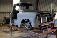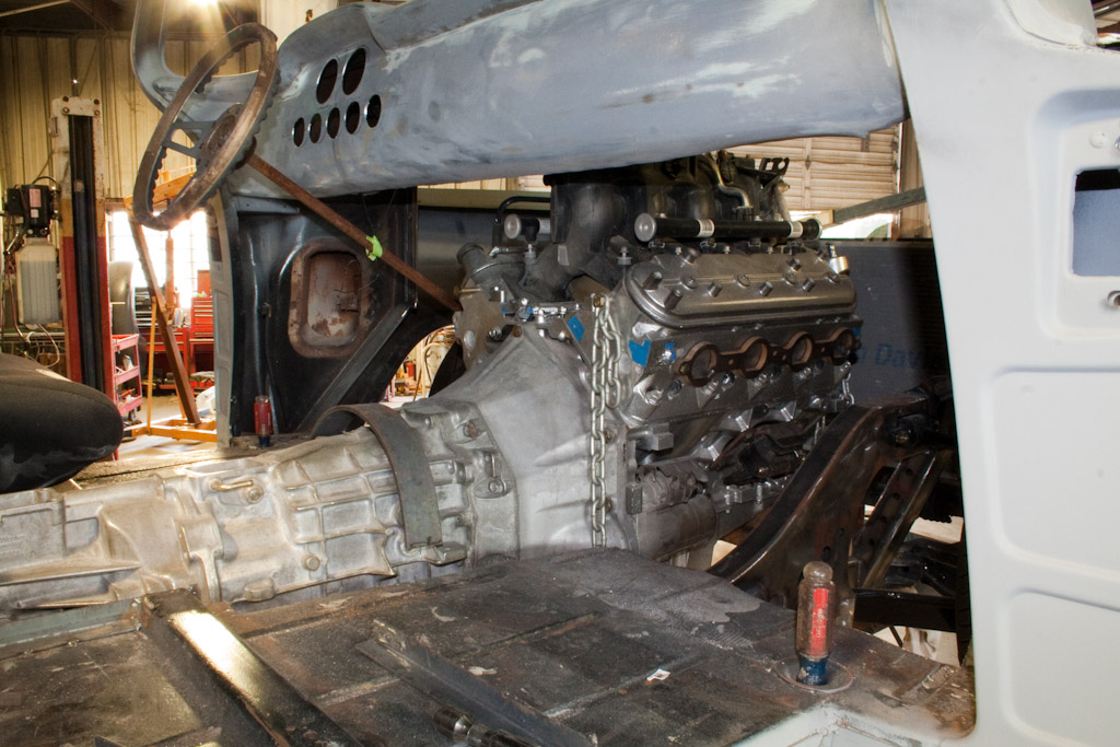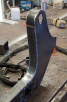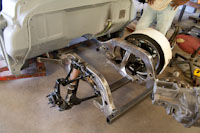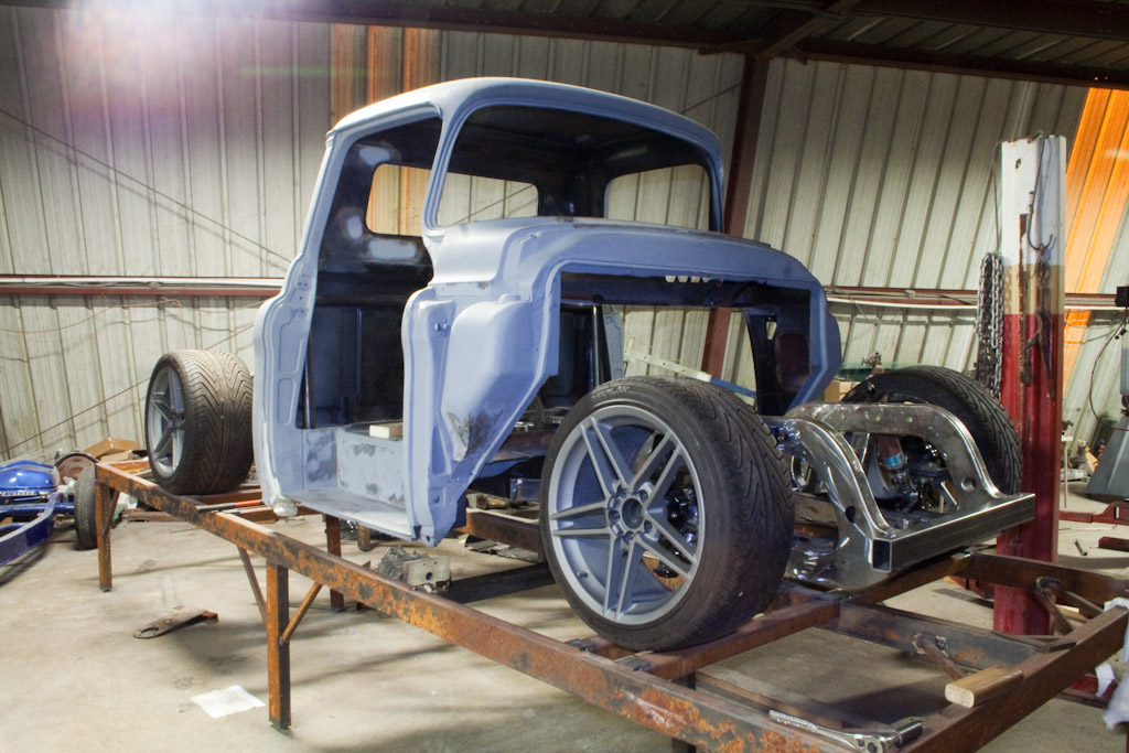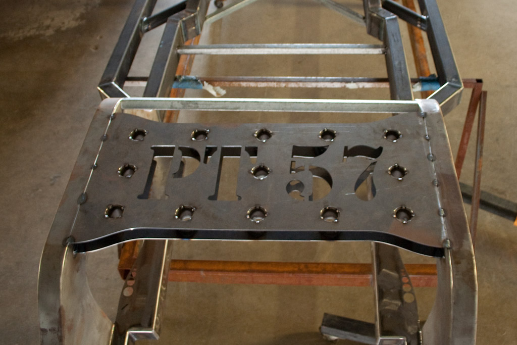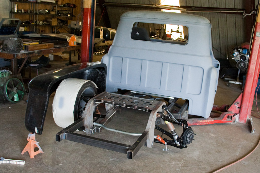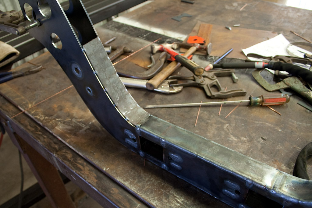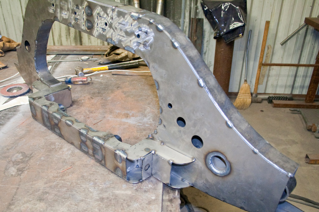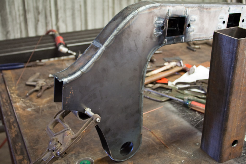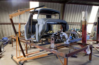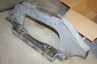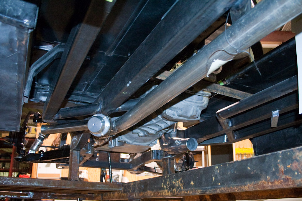 Back onto the jig table for driveline angling, exhaust and sheet metal work.
