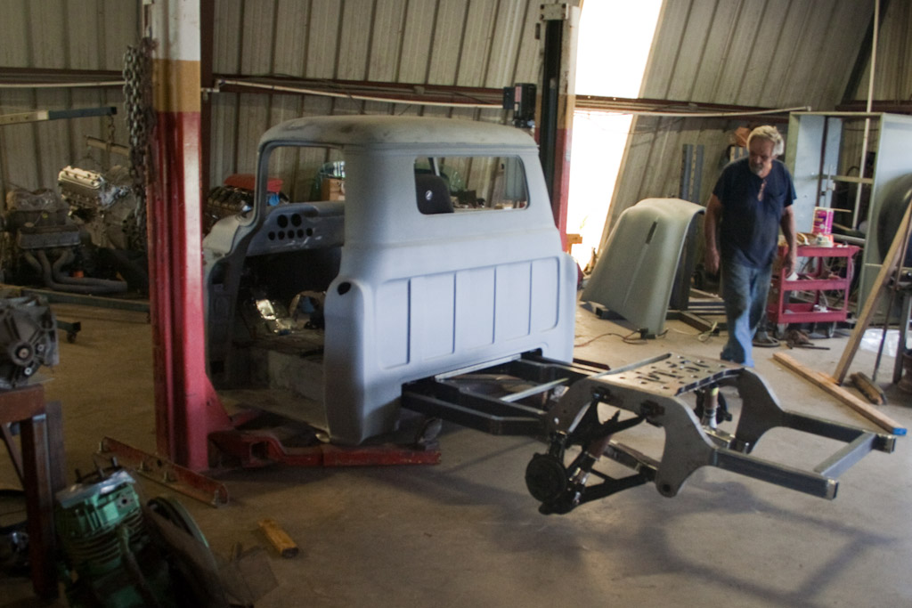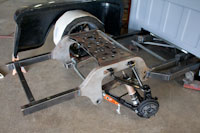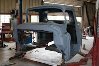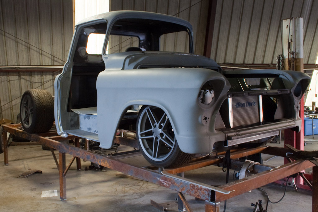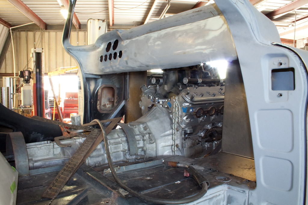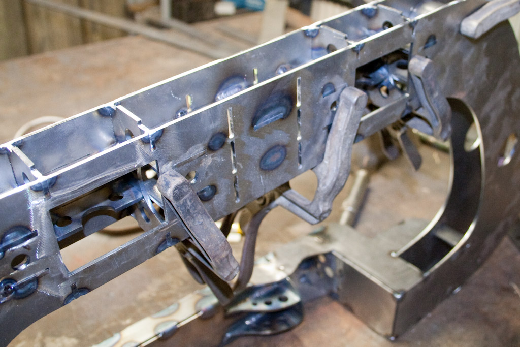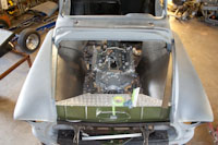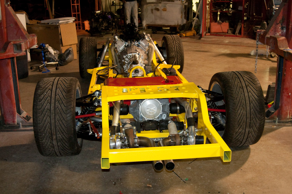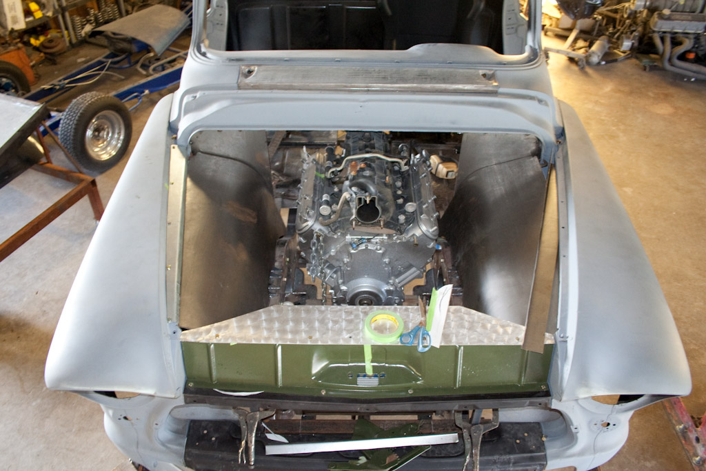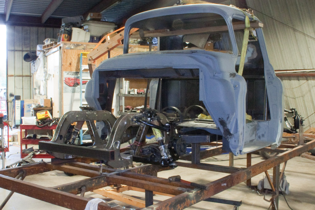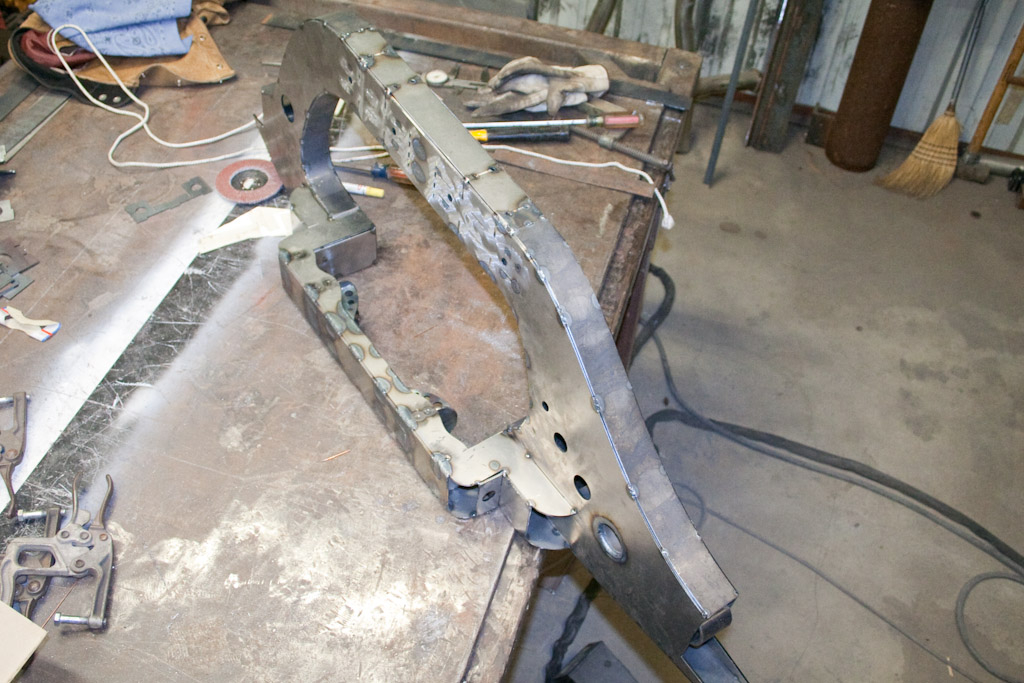 Back onto the jig table for driveline angling, exhaust and sheet metal work.