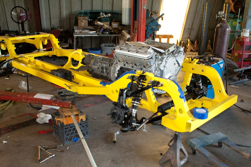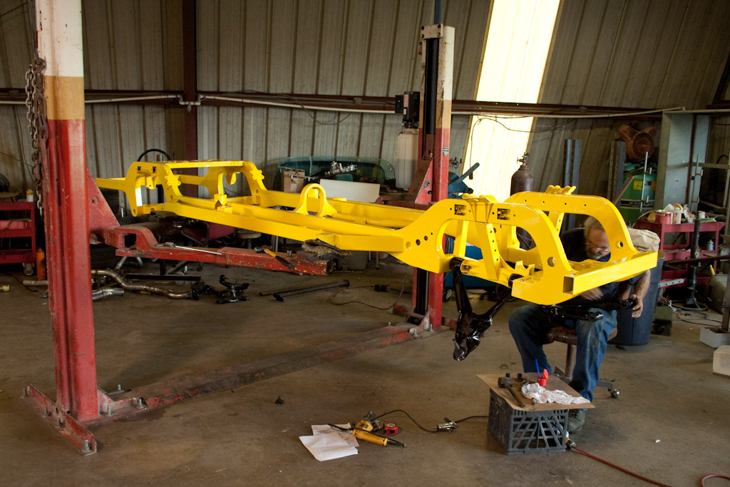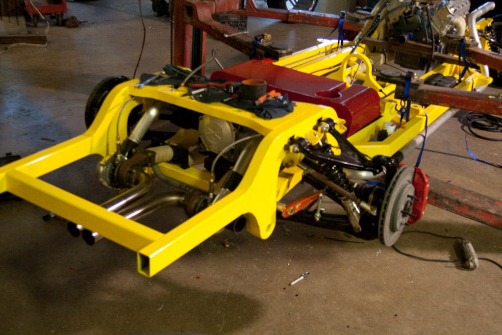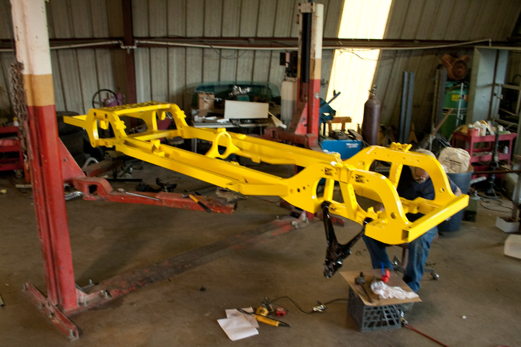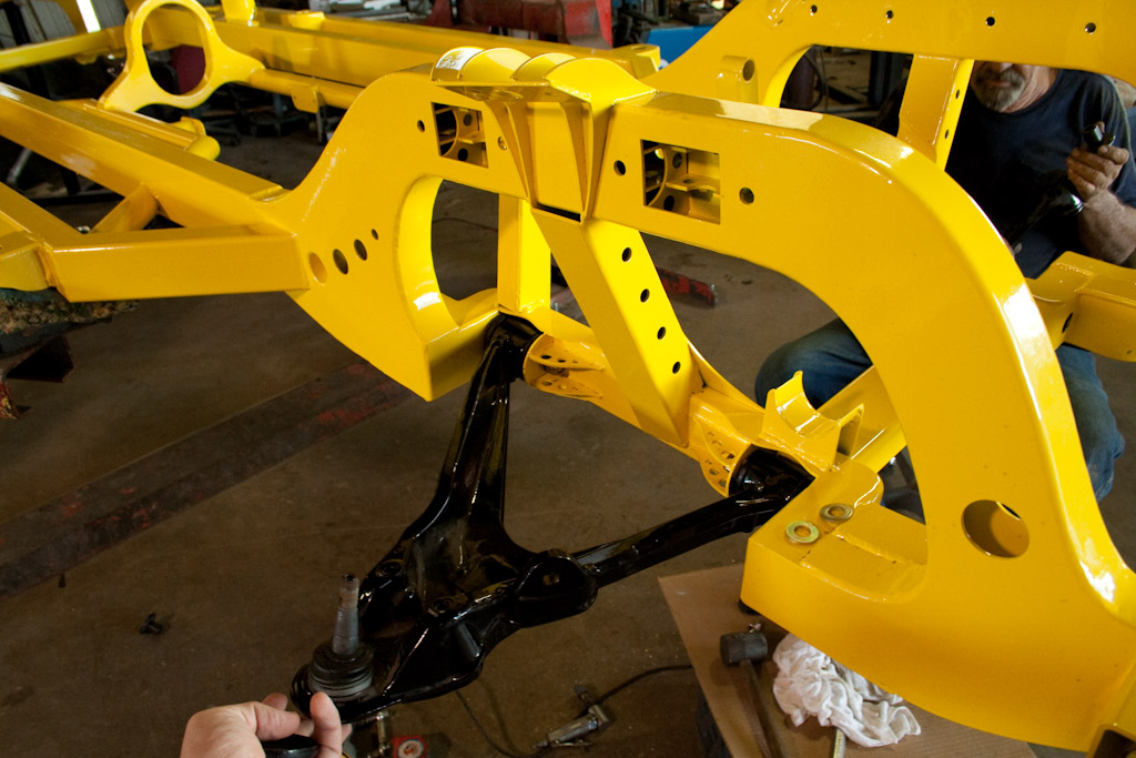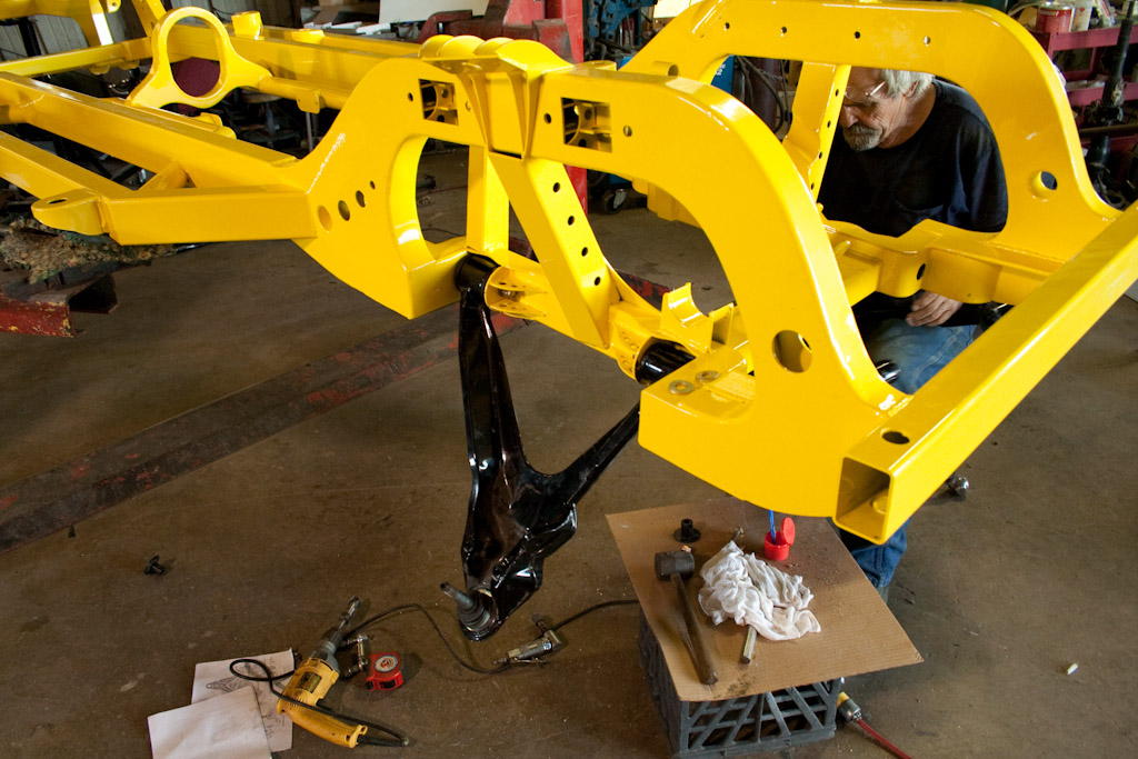 The frame just came back from the powder coat. We immediately started bolting on the suspension.