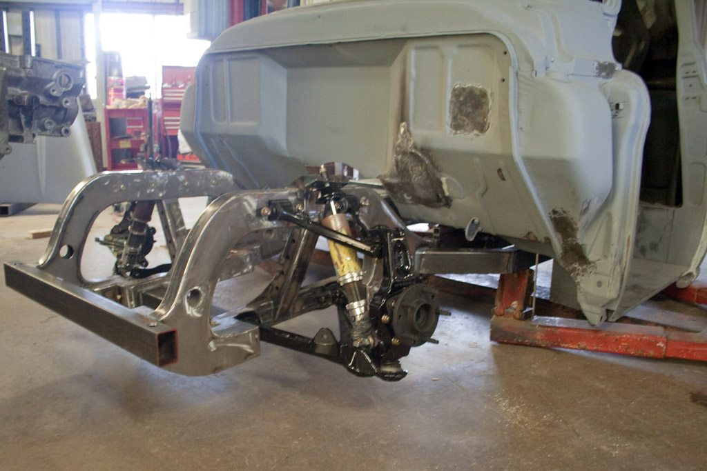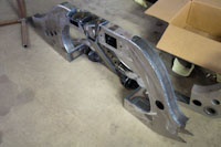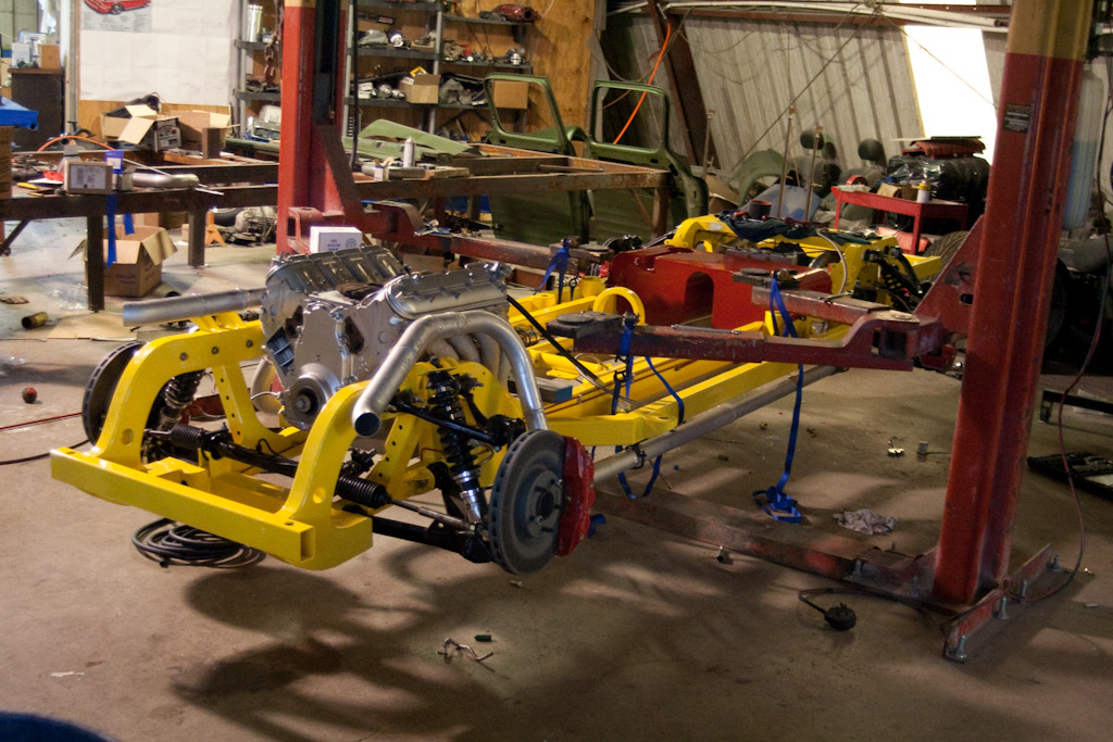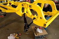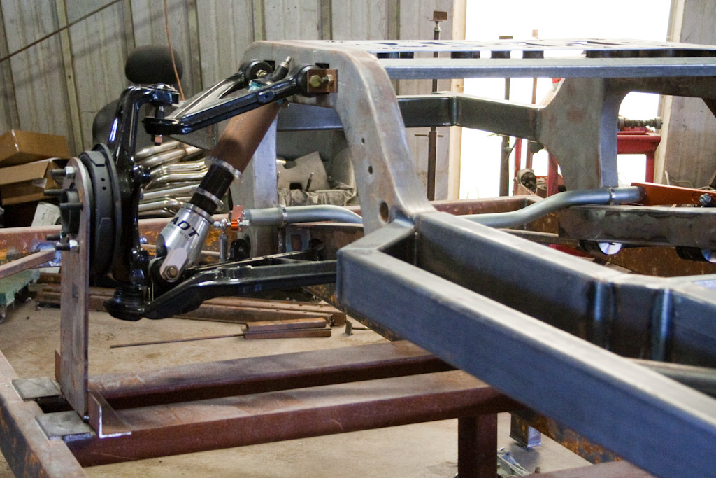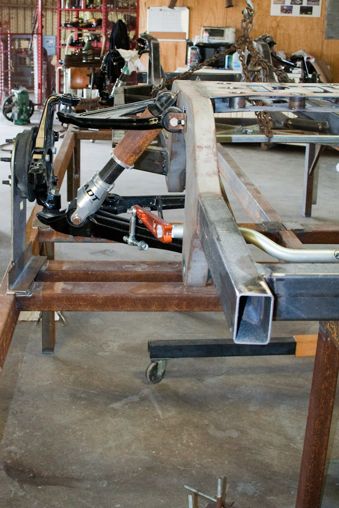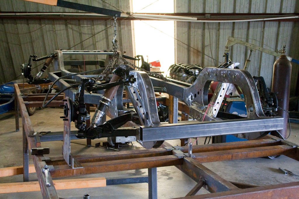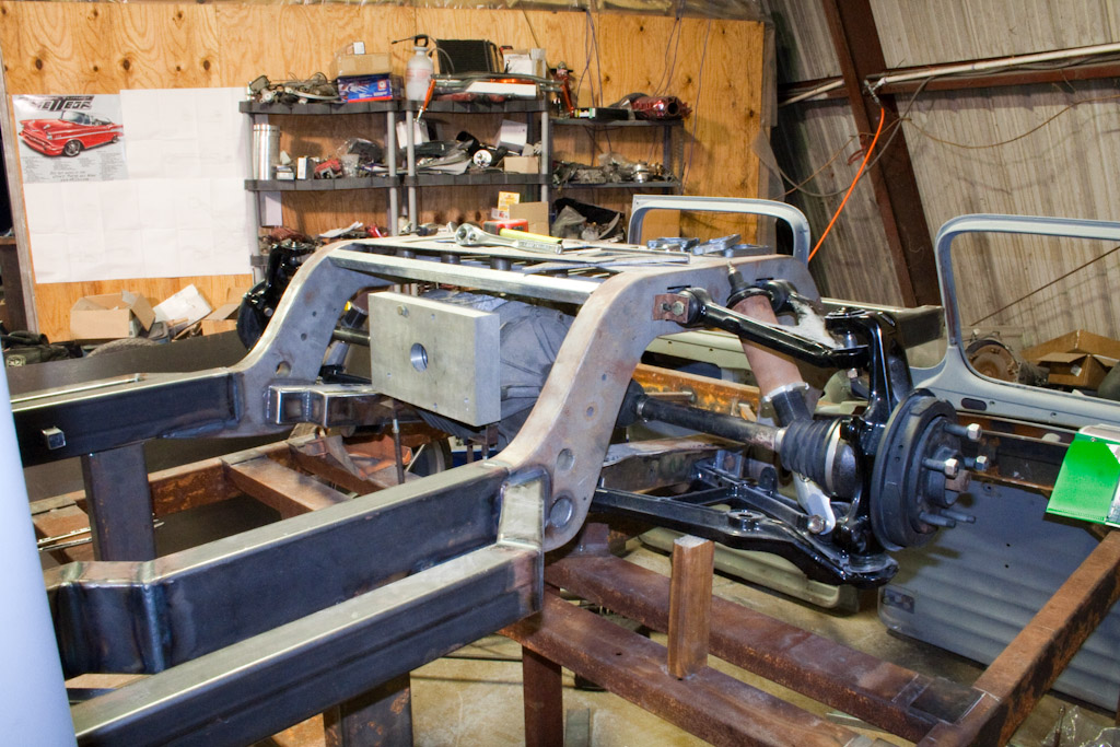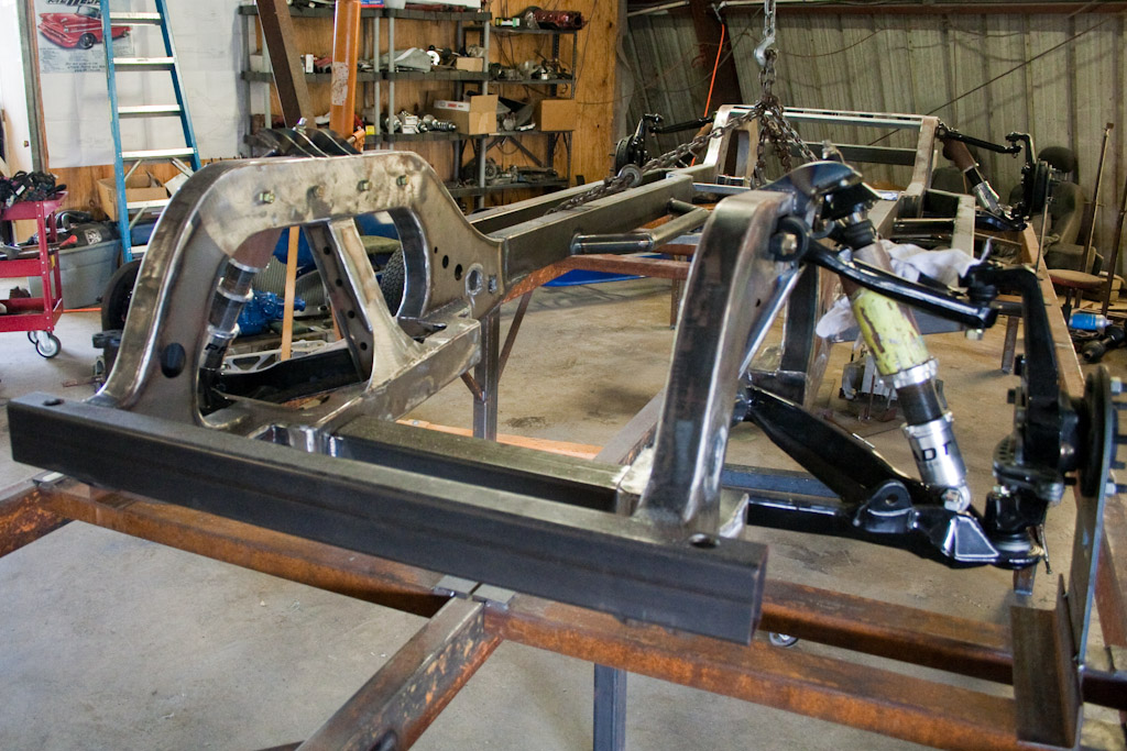 The frame just came back from the powder coat. We immediately started bolting on the suspension.