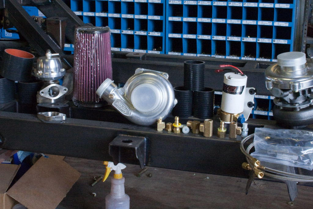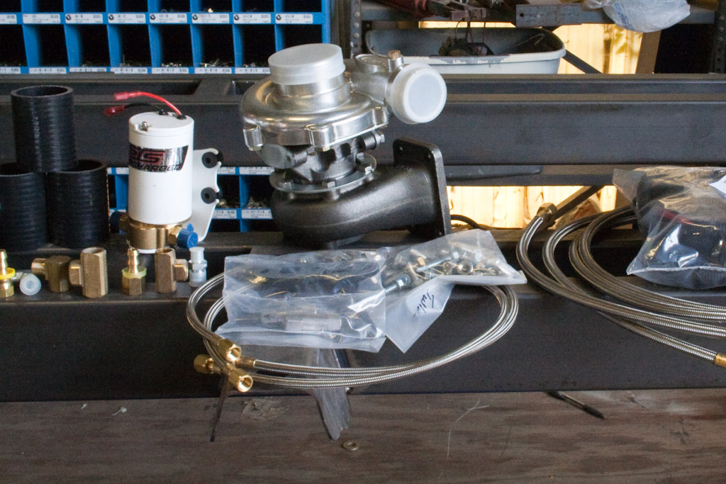 I can’t say enough good things about the guys at STS Turbos right now. Rick spent a day or 2 on the phone with me working out the specifics of the turbo and the design and placing of parts for optimal power. Next he went through the trouble to sort out there universal kit and pull out all the parts we didn’t need for our build and adjusted the price accordingly then specked out and supplied a cam specifically for our build. We’ll be pushing 6-7 PSI on 9.4:1 for the race making an easy 500+ HP. Considering I’m ditching the electronic cutouts and mufflers the only weight gain to the truck is the inner cooler and the compressed air piping. I’ll get more info up when our system gets here.
